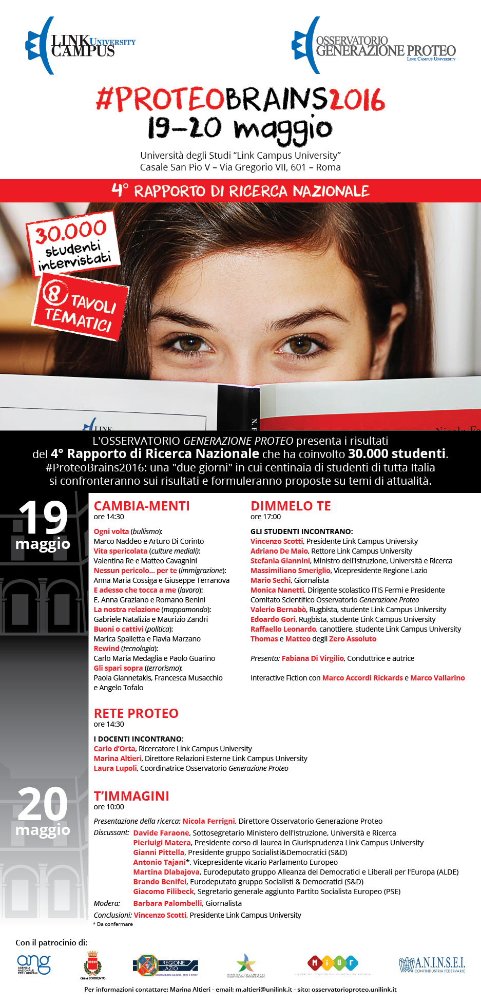 A differenza delle precedenti edizioni della ricerca, la presentazione dei risultati è avvenuta quest’anno in una cornice del tutto peculiare, ovvero la prima edizione dell’evento #ProteoBrains: una “due giorni” di dialogo in cui circa 400 studenti, provenienti da diverse regioni italiane, avranno la possibilità di confrontarsi con i docenti della Link Campus University e con ospiti d’eccezione espressione dal mondo della cultura e delle Istituzioni, su tematiche di estrema attualità quali la politica, il terrorismo, l’immigrazione, il lavoro, le tecnologie e i modelli culturali. A far da filo conduttore dell’evento la musica di Vasco Rossi, i titoli delle cui canzoni hanno scandito i diversi momenti in cui è stata articolata la “due giorni”.