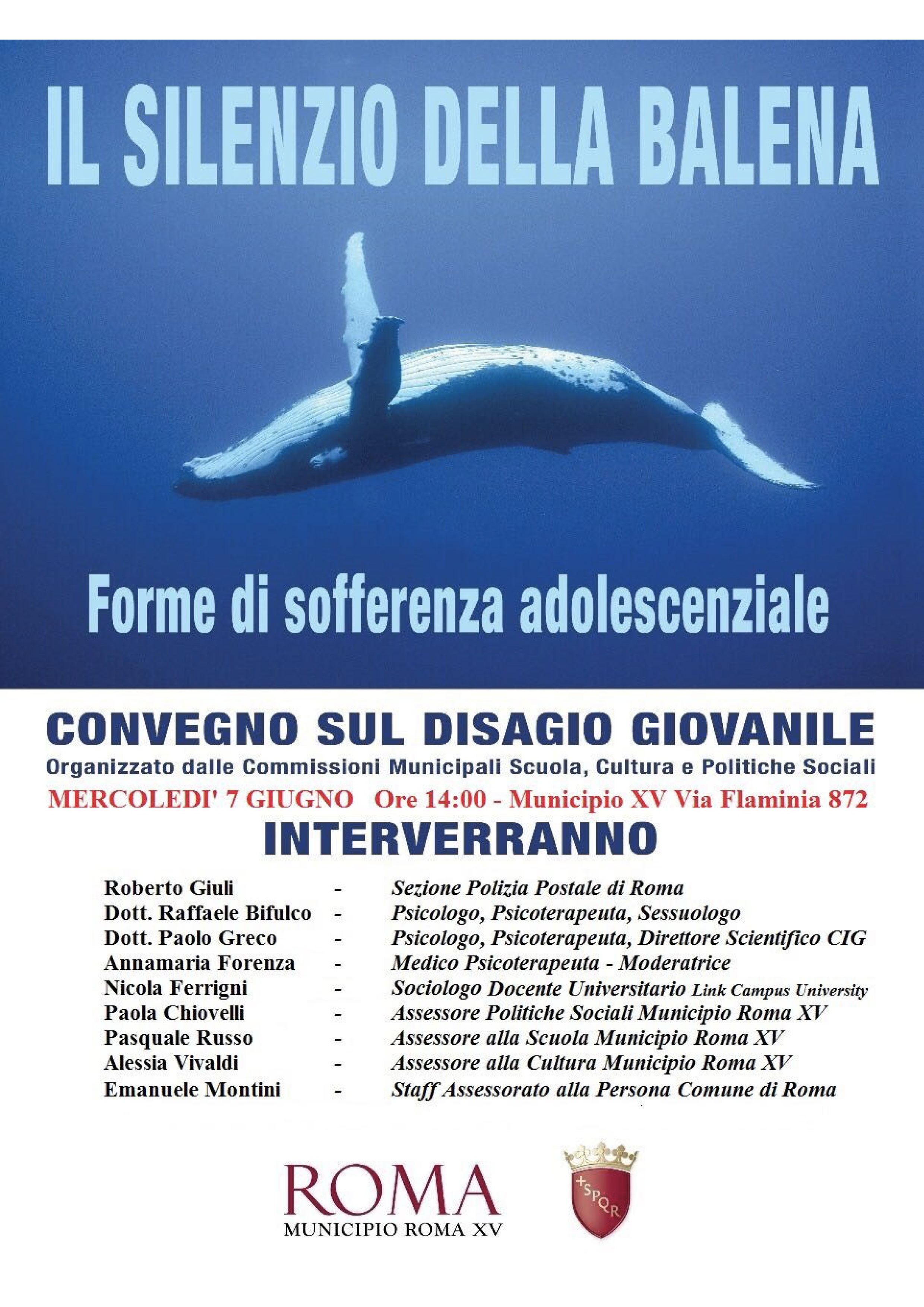 Queste sono solo alcune delle domande cui il sociologo Nicola Ferrigni, direttore dell’Osservatorio “Generazione Proteo”, cercherà di rispondere nel suo intervento in occasione del convegno “Il silenzio della balena. Forme di sofferenza adolescenziale”, organizzato dalle Commissioni Municipali Scuola, Cultura e Politiche Sociali del Municipio XV di Roma Capitale. Il convegno, previsto per mercoledì 7 giugno alle ore 14:00 presso la Sala Consiliare del Municipio in via Flaminia 872, rappresenterà un momento di incontro e confronto particolarmente interessante sul disagio giovanile e sui fenomeni attraverso cui esso tende oggi a prendere forma, a cominciare ovviamente dalla Rete. Nell’occasione, Nicola Ferrigni presenterà i primi risultati della sua ricerca sul fenomeno Blue Whale.