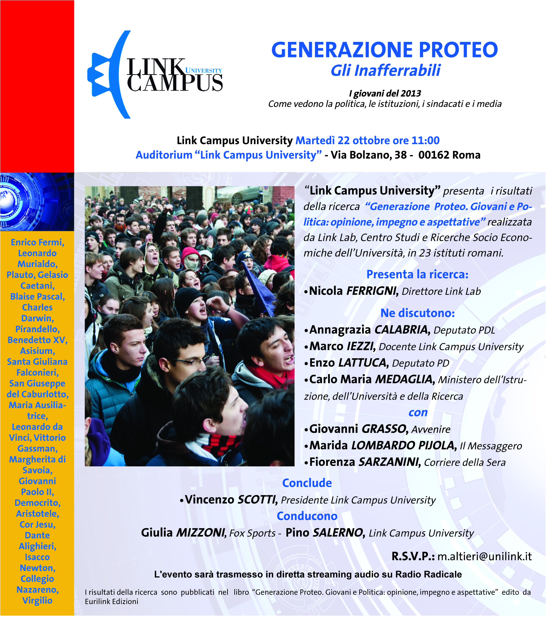 Martedì 22 ottobre 2013 è stato presentato a Roma il 1° Rapporto di ricerca, dal titolo “Generazione Proteo: gli inafferrabili”, realizzato dall’Osservatorio “Generazione Proteo” diretto dal sociologo Nicola Ferrigni. Il Rapporto di ricerca, il primo realizzato da neonato Osservatorio istituito all’interno di Link LAB, il Laboratorio di ricerca sociale della Link Campus University, studia l’universo giovanile italiano analizzandone in particolare il rapporto con la politica e le diverse forme della partecipazione. La ricerca, realizzata intervistando circa 1.000 studenti del quarto e del quinto anno degli Istituti scolastici secondari di secondo grado, ha coinvolto numerose scuole di Roma e provincia.