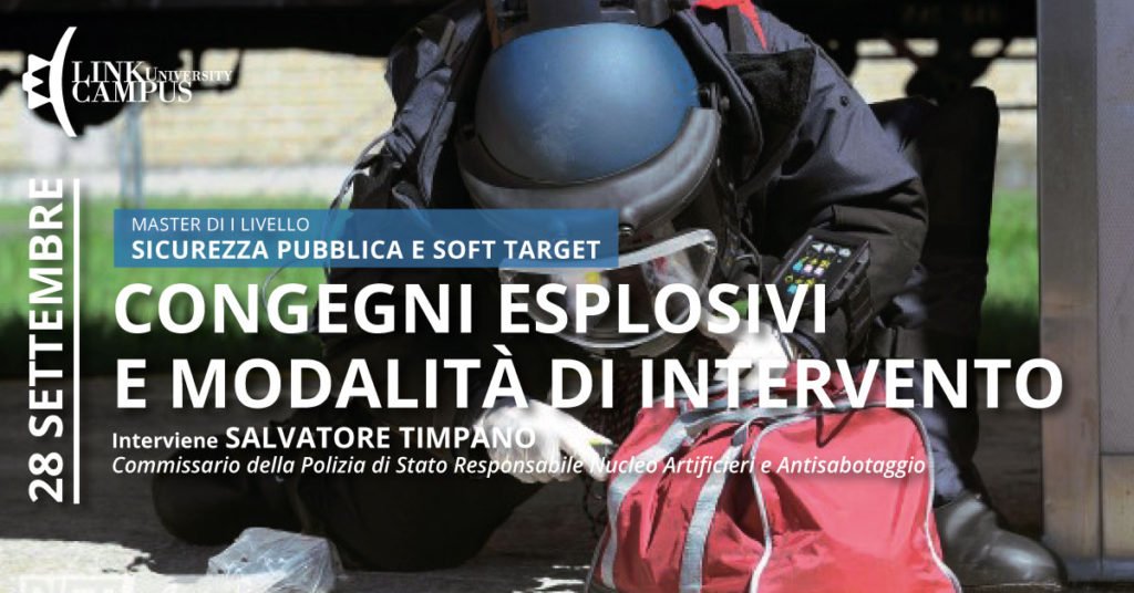 Venerdì 28 settembre, alle ore 14:30, nell’ambito delle attività didattiche del Master in Sicurezza Pubblica e Soft Target della Link Campus University, diretto dal Prof. Nicola Ferrigni, il Commissario Salvatore Timpano, responsabile del Nucleo Artificieri e Antisabotaggio della Polizia di Stato, terrà una lezione speciale sul tema dei congegni esplosivi e delle relative modalità di intervento. La lezione sarà arricchita da una dimostrazione pratica di alcune attività che vengono quotidianamente svolte dal Nucleo Artificieri.