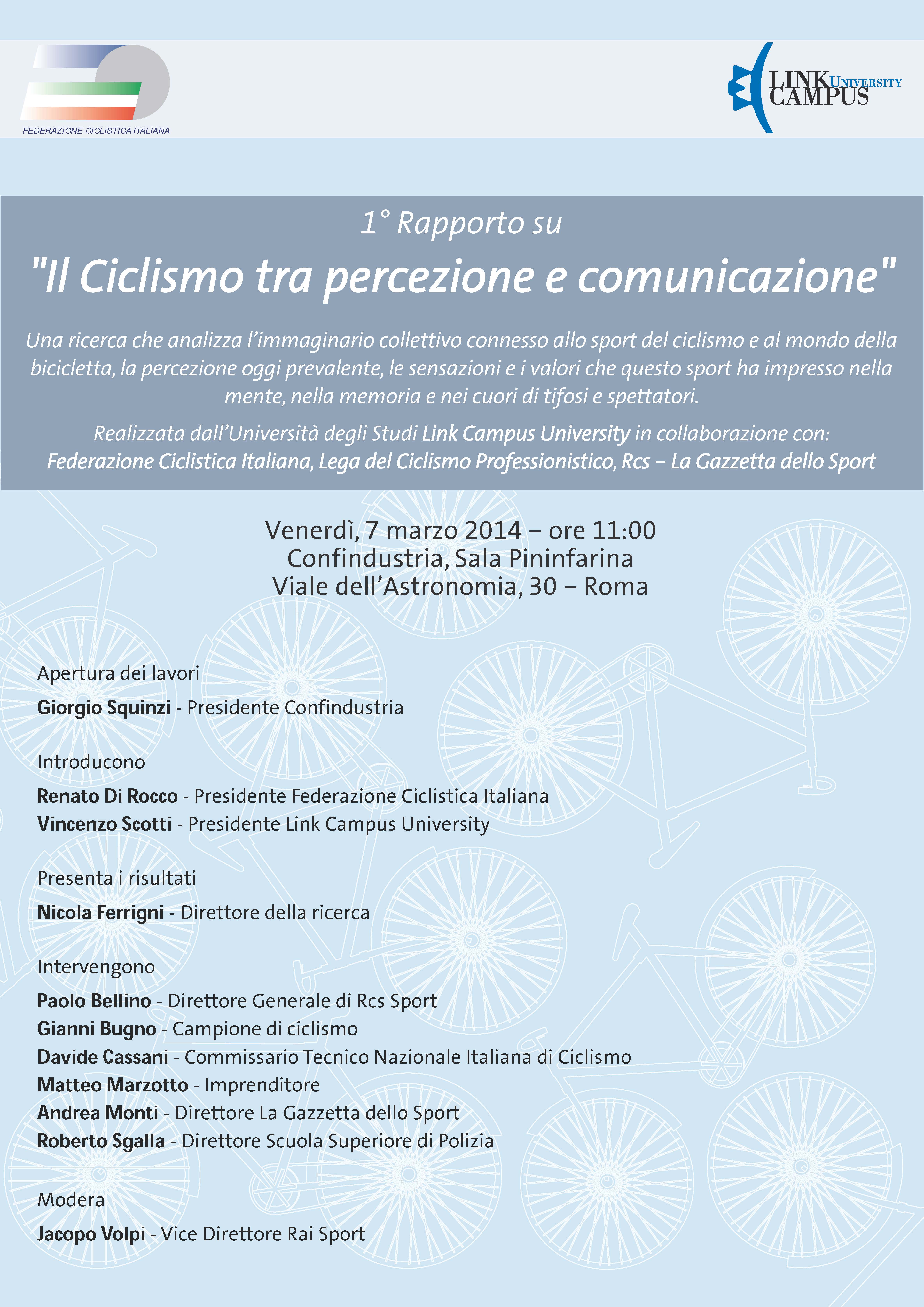 Venerdì 7 marzo, presso la sede di Confindustria, si è tenuta la presentazione del 1° Rapporto Nazionale sul Ciclismo, frutto di una ricerca realizzata da Link LAB in collaborazione con la Federazione Ciclistica Italiana, la Lega del Ciclismo Professionistico e Rcs-«La Gazzetta dello Sport». La ricerca è stata diretta dal sociologo Nicola Ferrigni.