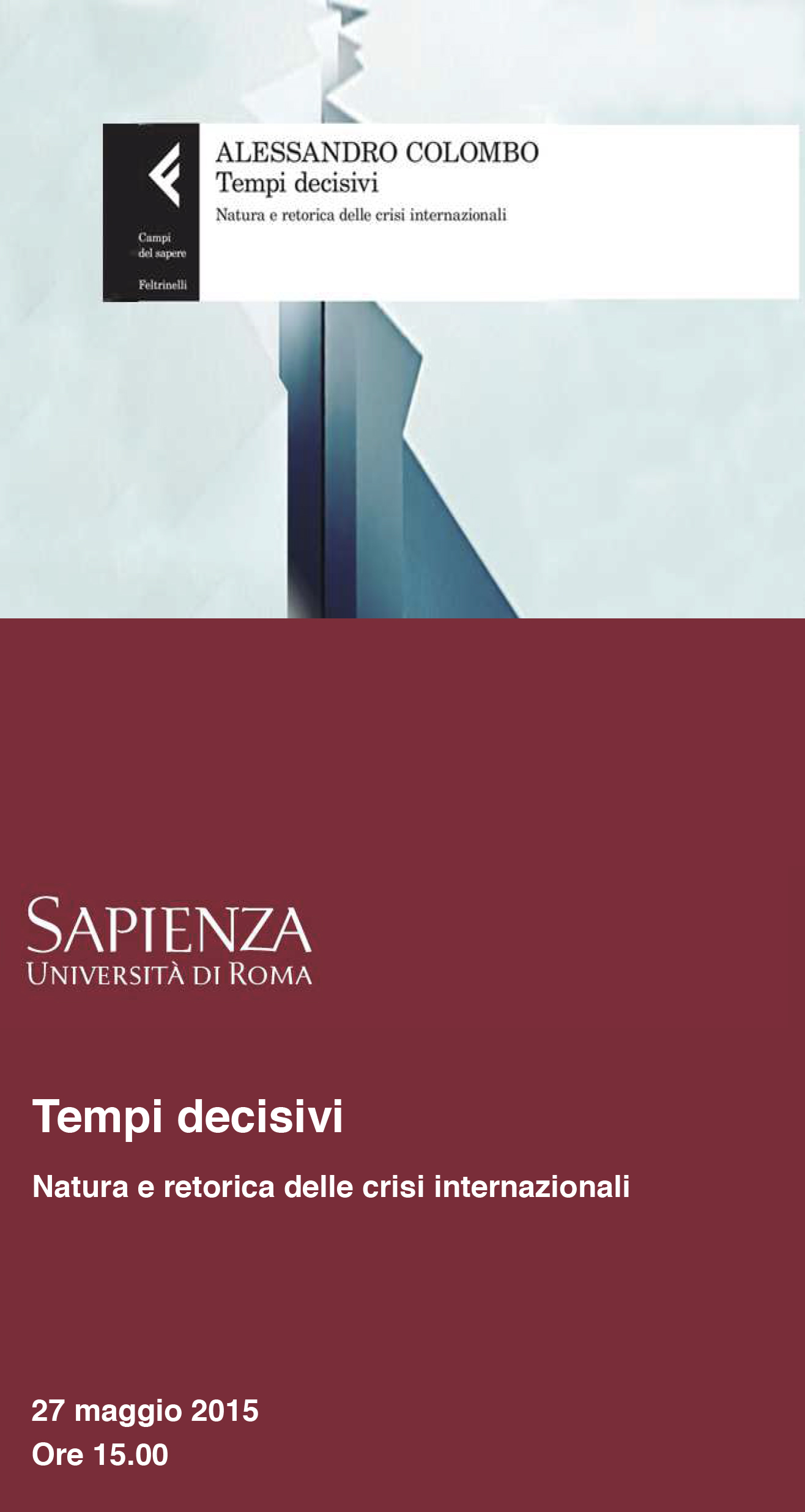Il 27 maggio 2015, presso la Sala del Senato accademico di Sapienza-Università di Roma, si è tenuta la presentazione del volume di Alessandro Colombo dal titolo “Tempi decisivi. Natura e retorica delle crisi internazionali”. A discutere il volume Antonello Folco Biagini, prorettore di Sapienza-Università di Roma, Oreste Massari (Sapienza-Università di Roma), Paolo Calzini (Sais John’s Hopkins University), Sofia Ventura (Università di Bologna Alma Mater), Gianluca Passarelli (Sapienza-Università di Roma).
